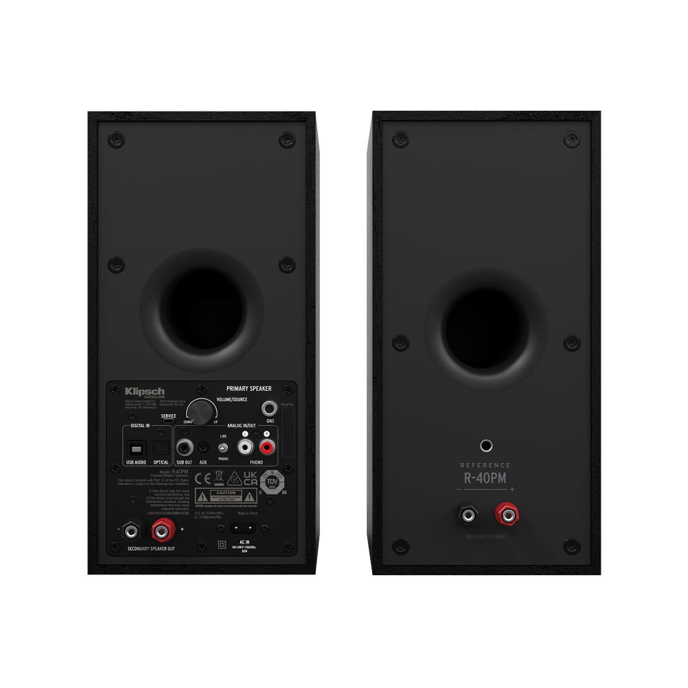 Активні динаміки R-40PM підключаються через Bluetooth® для потокової передачі музики, фоно (із заземленим гвинтовим роз’ємом) для програвачів, а також цифровий і аналоговий сигнали для всього між ними. І оскільки інженери Klipsch створили індивідуальний підсилювач, ви отримуєте ідеально налаштований звук – не потрібен аудіо/відео приймач (AVR).