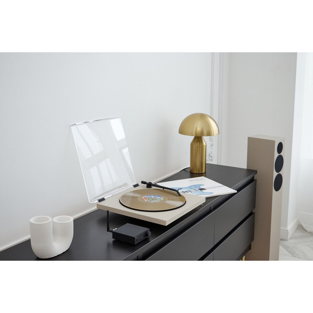 Центром комплекту є Tone Factory Turntable — витончений програвач у кольорі Dune Grey, що поєднує просту форму з увагою до деталей. Він вирізняється тихохідним приводом і надійною конструкцією, яка забезпечує стабільне та чисте відтворення платівок. Це програвач, який виглядає сучасно, але звучить по-справжньому аналогово.