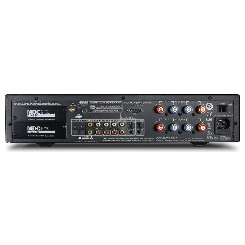 На задній панелі підсилювача знаходиться вхід для підключення звукознімача програвача вінілу - NAD має великий досвід у побудові цих схем. Також в NAD C 368 передбачена і пара лінійних аналогових входів, а також є по два коаксіальних та оптичних входи та вбудований Bluetooth-приймач з підтримкою кодека aptX. Тип ЦАП в специфікаціях на цю модель не вказаний, але за непрямими ознаками можна припустити, що це ESS Sabre. Все вищезгадане також говорить про те, що C 368 непогано оснащений, але список його можливостей насправді ще ширший.