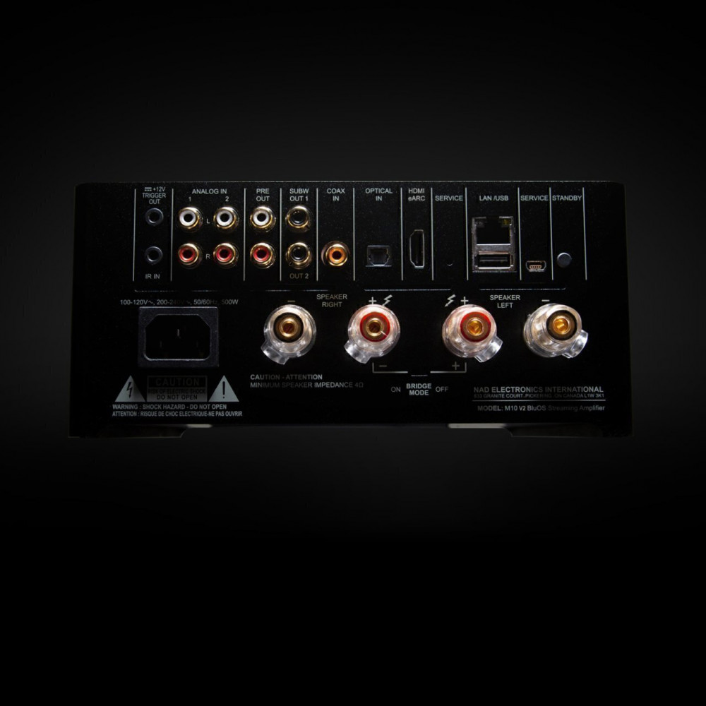 Поряд з акустичними клемами аудіофільського класу він оснащений двома незалежними гніздами для сабвуфера, вихідні параметри якого регулюються за допомогою програми BluOS . У M10 V2 додано декодування об'ємного звуку Dolby Digital. Любителі домашніх кінотеатрів можуть налаштувати пару бездротових колонок або підсилювачів BluOS з підтримкою об'ємного звучання на відтворення каналів об'ємного звучання, в той час як основні колонки працюватимуть з фронтальними каналами, таким чином M10 V2 стане центром 4.1- або 4.2-канальної системи об'ємного звучання Dolby Digital. M10 V2 передає тилові канали бездротовою мережею з дуже низькою затримкою, тому вам не доведеться прокладати дроти по кімнаті для підключення колонок об'ємного звучання.